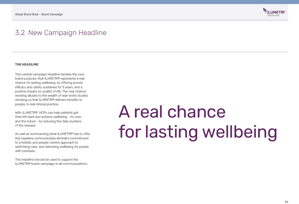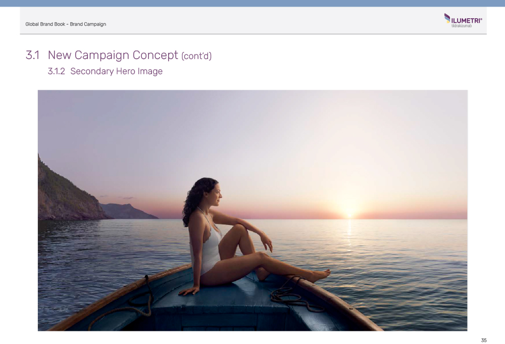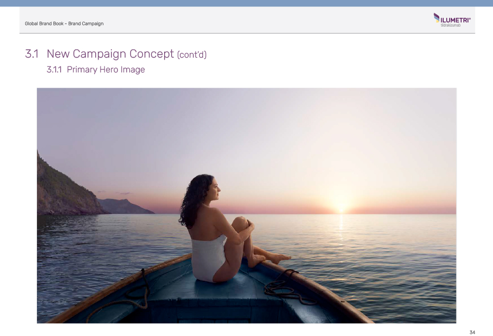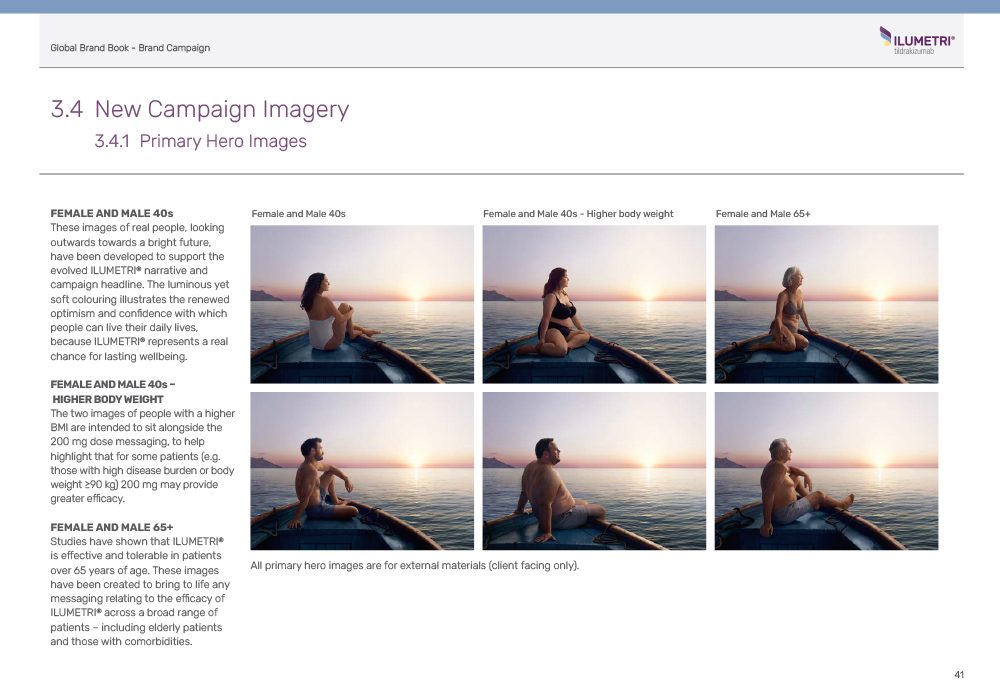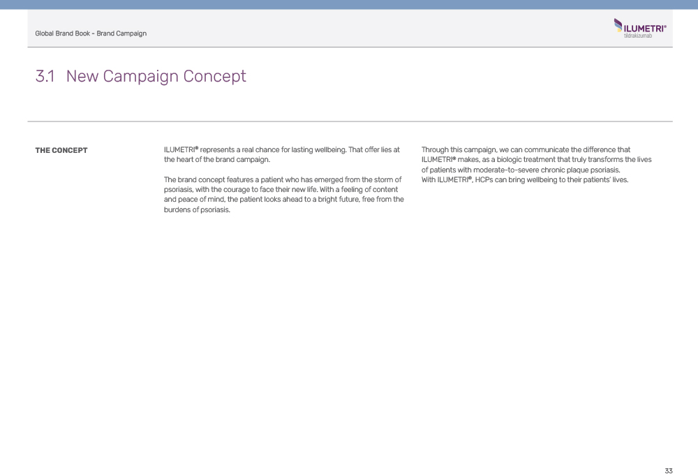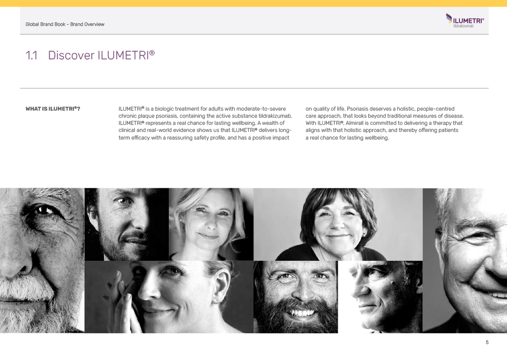 A global brandbook showcasing the Ilumetri brand story, campaign, secondary campaign images and all other assets that can be utilised when creating materials to represent the brand.