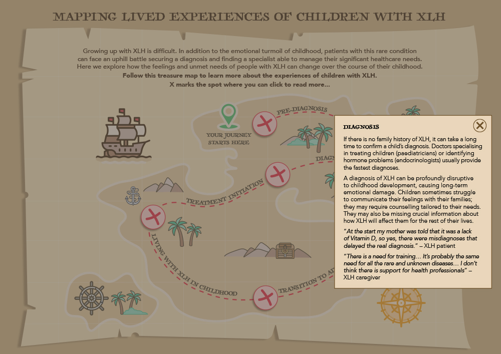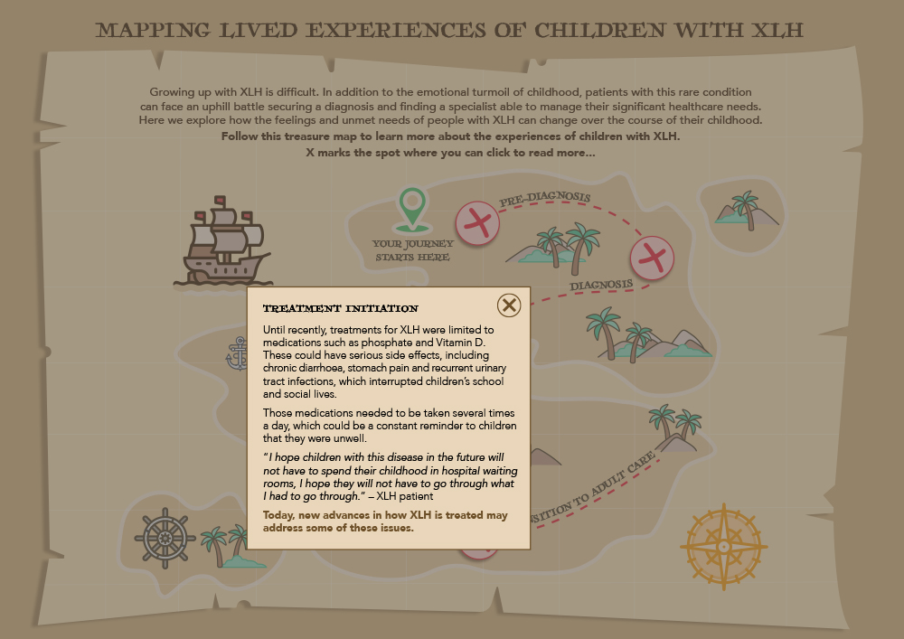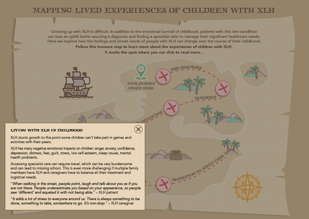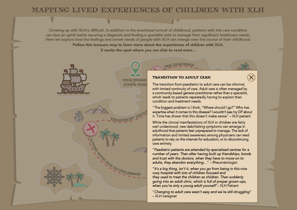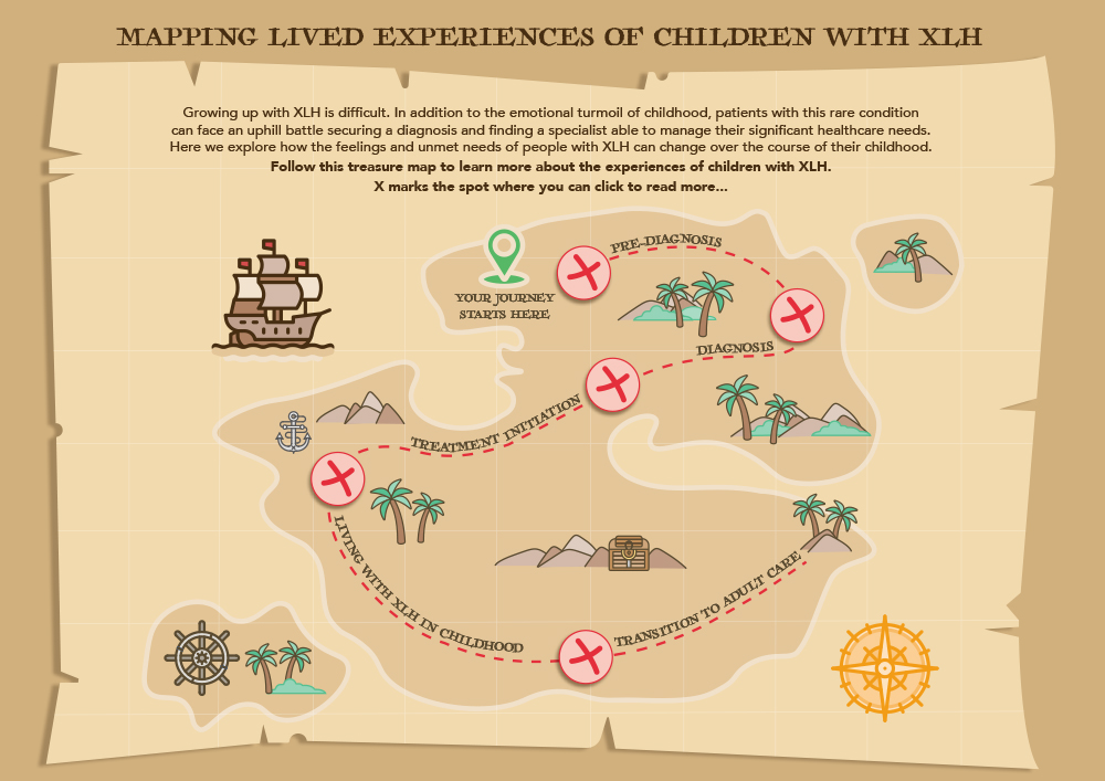 These challenges are visually shown through an age appropriate illustration of a treasure map. Each marker represents a hurdle that the patient has to step over. These challenges are a true reflection of a patients practical and emotional burden where they may not get the support and help they need.