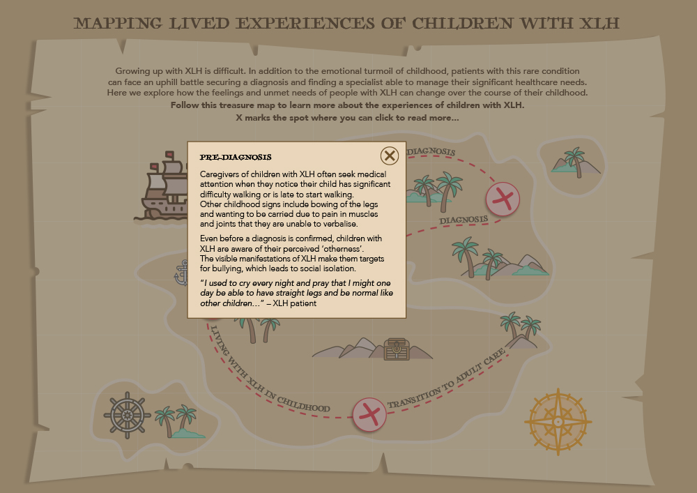 This concept focuses on the challenges that young patients have faced or will face throughout their lives when dealing and living with XLH. Children are often left feeling isolated and very aware of their perceived ‘otherness’ feeling like they are alone on this journey which is a very different pathway to children without XLH.